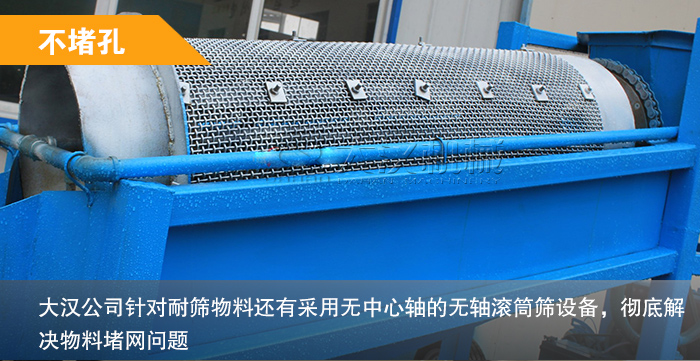 建筑垃圾形態不一,物料內還還有大量的雜質,使用普通振動篩根本無法克服篩孔堵塞這一現象,而滾筒篩分機可設有梳型清篩機構,在篩分過程中,不管進入篩分筒的物料多臟、多雜都可以篩分,從而提高了設備的篩分效率,我們大漢公司針對耐篩物料還有采用無中心軸的無軸滾筒篩設備,解決物料堵網問題。