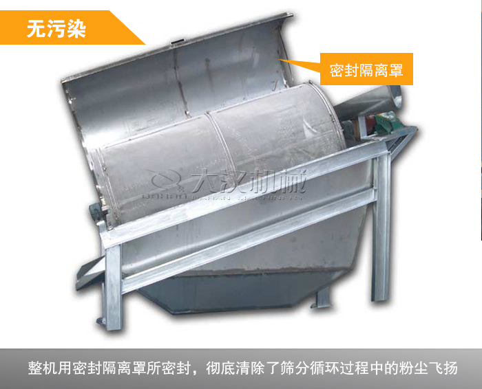 整機用密封隔離罩所密封,清除了篩分循環過程中的粉塵飛揚,塊狀飛濺等現象,減少對工作環境的污染。