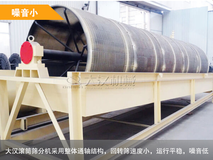 大漢滾筒篩分機采用整體通軸結構,回轉篩速度小,運行平穩,并且有密封隔離罩與外界隔離,減低工作噪音。