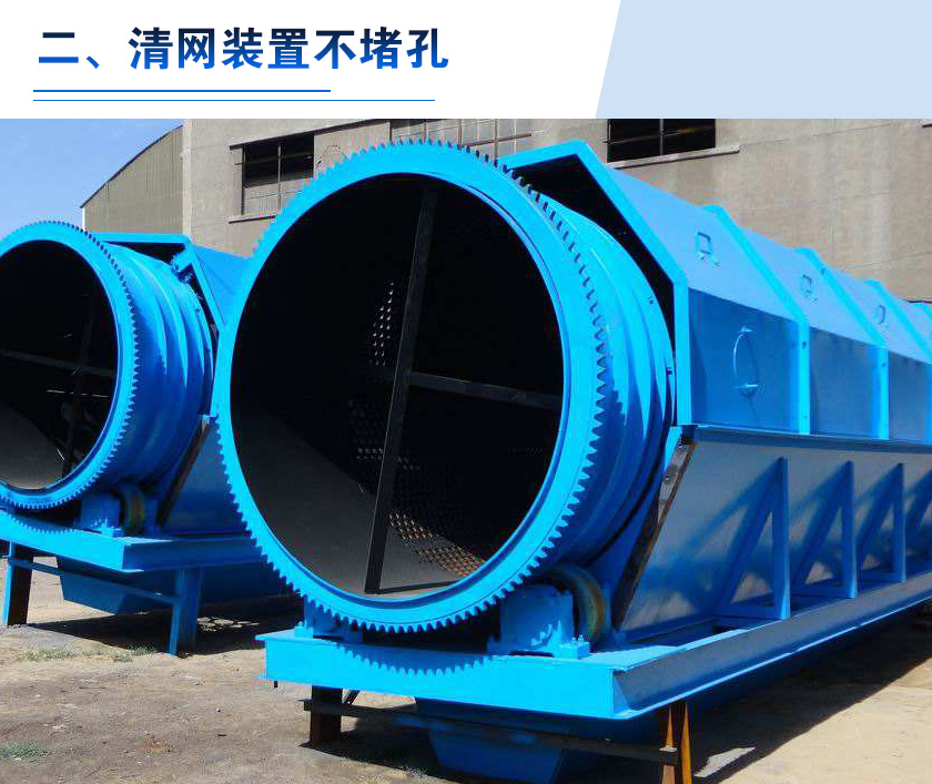 無軸滾筒篩內置清網裝置,到需要分選的生活垃圾倍送入篩分機滾筒中,通過不同翻滾來達到篩選的效果,二其清網裝置會不間斷地對篩同實施清理,使篩分筒在整個工作過程中始終保持清潔、不粘、不堵。