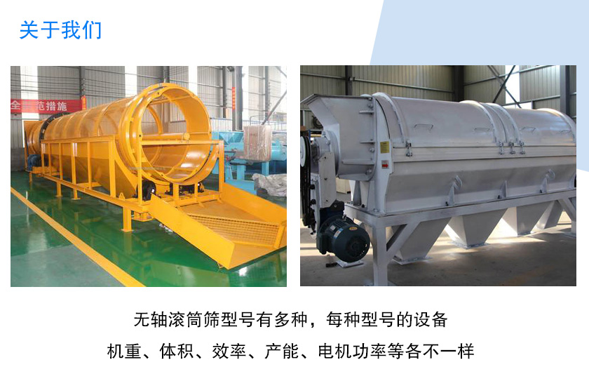 提示:無軸滾筒篩型號有多種,每種型號的設備機重、體積、效率、產能、電機功率等各不一樣,型號越大的無軸滾筒篩體積越大、產能更高,價格也會稍貴些,不過給客戶帶來的經濟利潤將會更顯著;反之,型號小的無軸滾筒篩價格低,適合于小規模企業,效益較大型號設備低些。