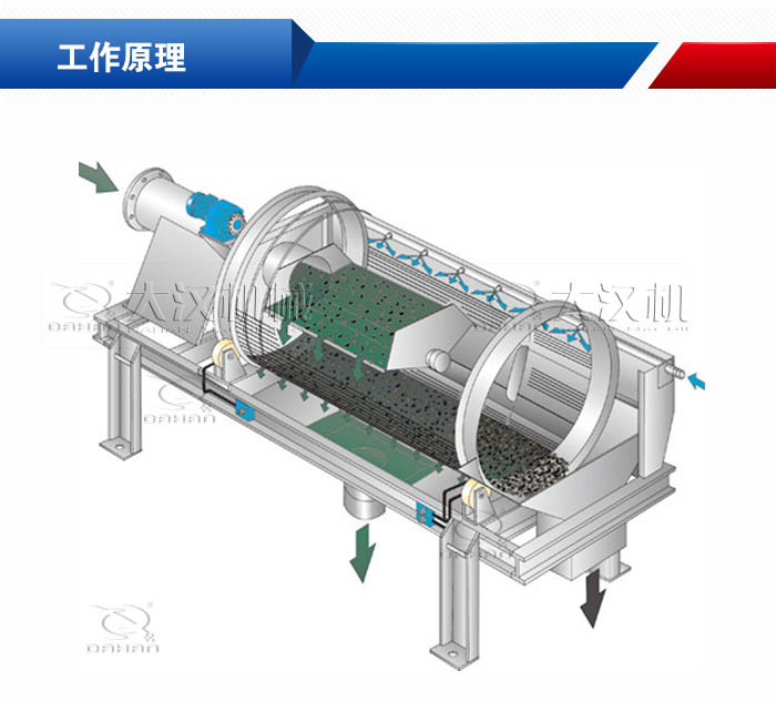 滾筒式篩沙機,即滾筒篩沙機,按照用戶產量的大小可以分為大型滾筒式篩沙機或小型滾筒式篩沙機,是分選技術中應用非常廣泛的一種新型篩料設備。它克服了圓振動篩和直線篩在篩分較濕物料時出現的篩網堵塞問題,提高了篩分系統的產量和可靠性。