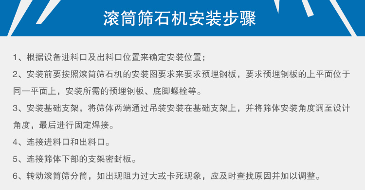 2、安裝前要按照滾筒篩石機的安裝圖要求來要求預埋鋼板,要求預埋鋼板的上平面位于同一平面上,安裝所需的預埋鋼板、底腳螺栓等。