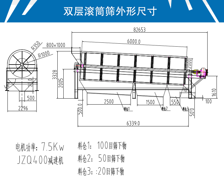 雙層滾筒篩主要由電機、減速機、滾筒裝置、機架、密封蓋、進出料口組成,下面詳細介紹以下幾個部分:
