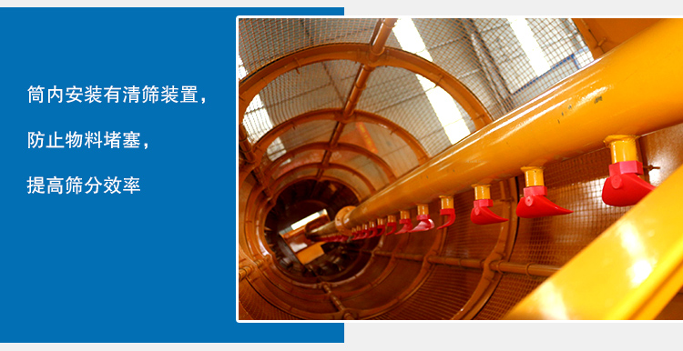 5、筒內安裝有清篩裝置,防止物料堵塞,提高篩分效率。