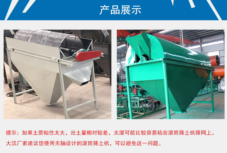 提示:如果土質(zhì)粘性太大,出土量相對較差,太濕可能比較容易粘在滾筒篩土機(jī)篩網(wǎng)上,大漢廠家建議您使用無軸設(shè)計(jì)的滾筒篩土機(jī),可以避免這一問題。