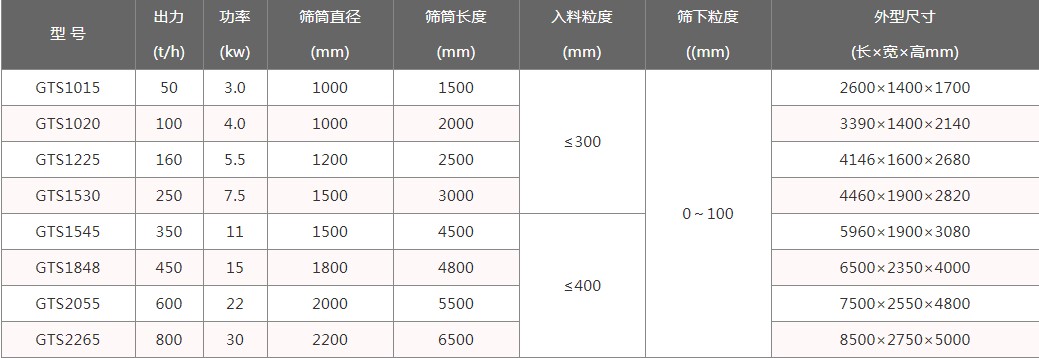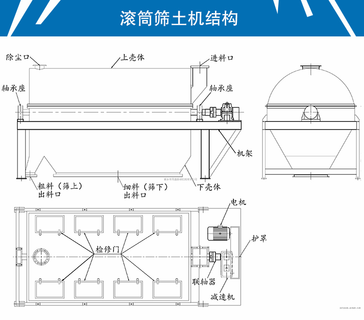 滾筒裝置在驅(qū)動裝置的驅(qū)動下轉(zhuǎn)動,當(dāng)物料進(jìn)入滾筒裝置后,由于滾筒裝置的傾斜與轉(zhuǎn)動,使篩面上的物料翻轉(zhuǎn)與滾動,使合格物料(篩下產(chǎn)品)經(jīng)滾筒后端底部的出料口排出,不合格的物料(篩上產(chǎn)品)經(jīng)滾筒尾部的排料口排出。