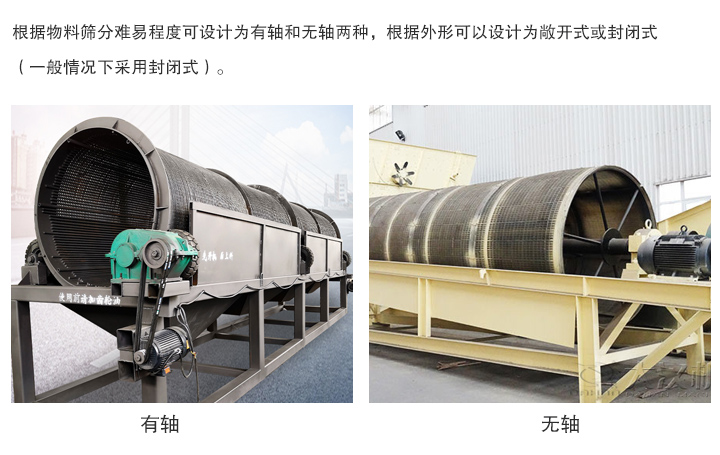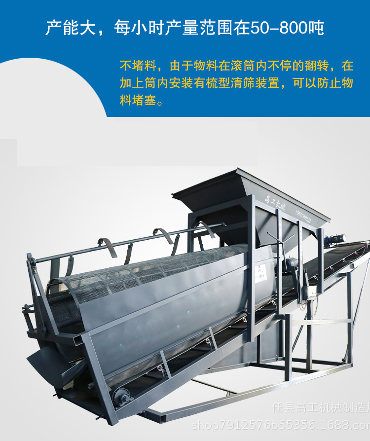 3、不堵料,由于物料在滾筒內不停的翻轉,在加上筒內安裝有梳型清篩裝置,可以防止物料堵塞。
