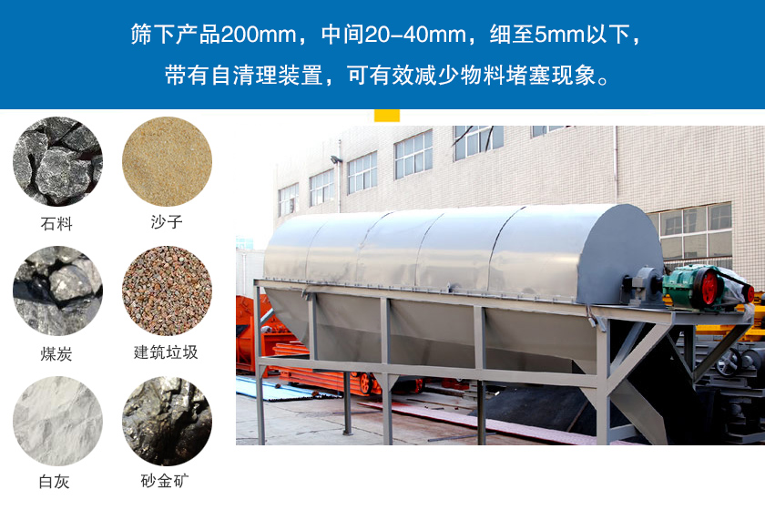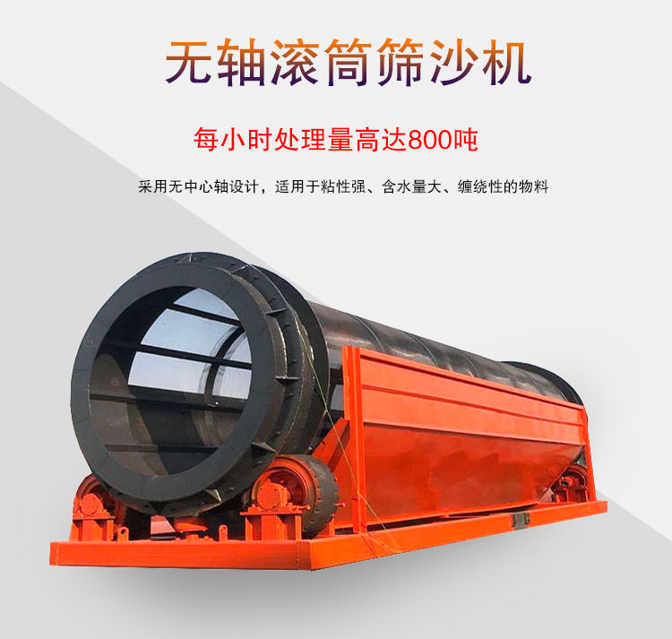 無軸滾筒篩沙機適合篩分石料、沙子、建筑垃圾及潮濕易堵塞的物料,廣泛用于冶金、建材、煤炭、化工等行業,篩下產品200mm,中間20-40mm,細至5mm以下,帶有自清理裝置,可有效減少物料堵塞現象。