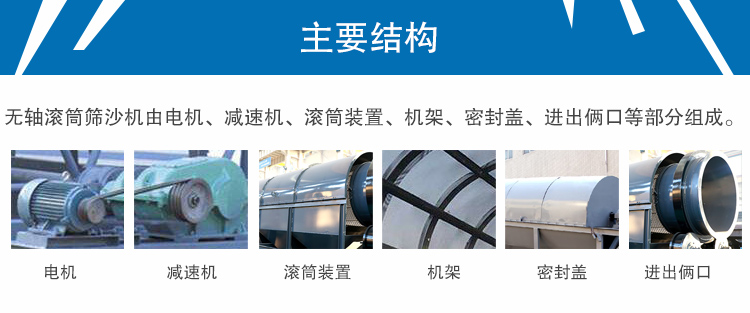 無軸滾筒篩沙機由電機、減速機、滾筒裝置、機架、密封蓋、進出料口等部分組成。