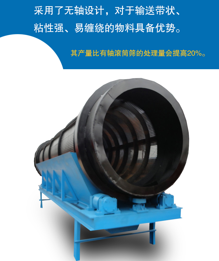 無軸滾筒篩沙機簡稱無軸滾筒篩,與有軸滾筒篩相比,由于采用無中心軸設計,適用于粘性強、含水量大、纏繞性的物料,如:建筑垃圾、白灰等,由于物料在滾筒內的翻轉、滾動,使卡在篩孔中的物料可被彈出,防止篩孔堵塞,無軸滾筒篩沙機的設計擺脫了普通振動篩在篩分較濕物料是出現的篩孔堵塞問題,提高了設備的產能和可靠性。