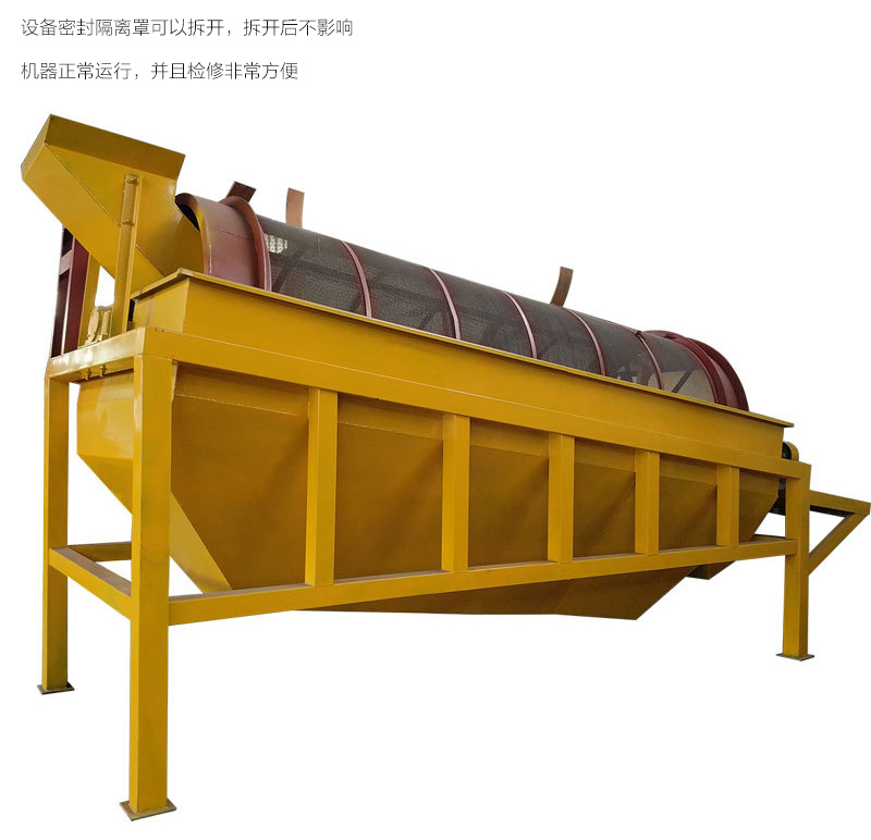 主體結構是篩分筒,它是由若干個圓形狀篩網組成,整體與地平面成傾斜狀態,外部被密封隔離罩所密封,以防止污染環境。電動機經減速器與滾筒裝置通過聯軸器連接在一起,驅動滾筒裝置繞其軸線轉動,物料自上而下通過篩分筒分離,細料從篩分筒前端下部排出,粗料從篩分筒下端尾部排出。