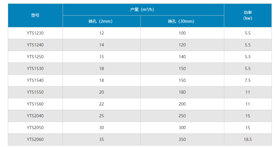 YTS1230小型滾筒篩 篩體規格φ1*3,篩體傾角5°-7°,筒體轉速22.5轉/分,進料粒度60mm,產量為10-60噸/時。