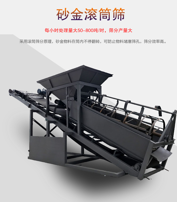 1、采用滾筒篩分原理,砂金物料在筒內不停翻轉,可防止物料堵塞篩孔,篩分效率高。