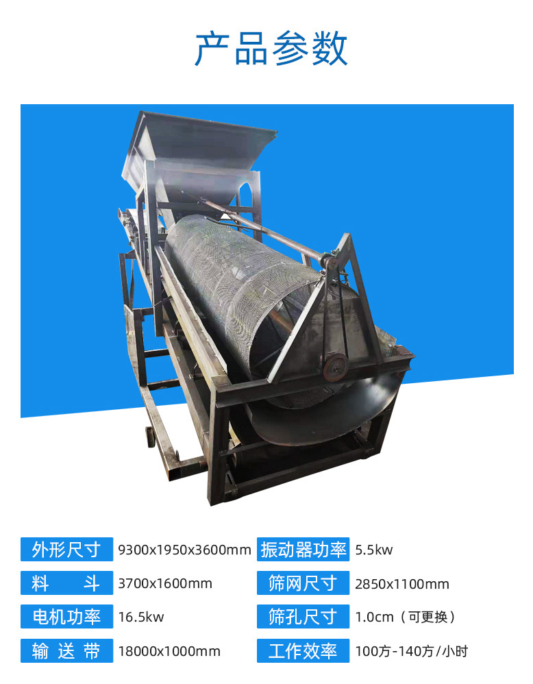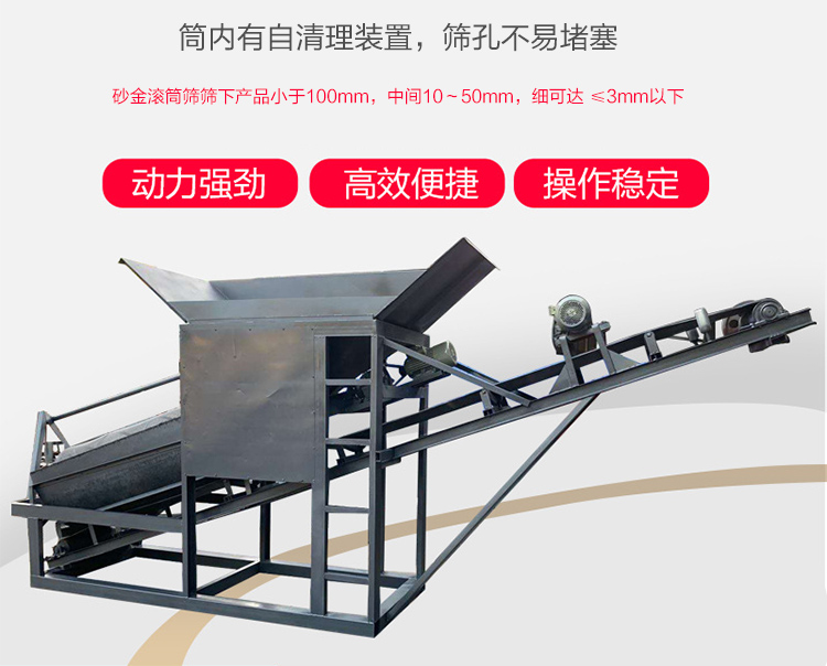 砂金滾筒篩篩下產品小于100mm,中間10~50mm,細可達 ≤3mm以下。