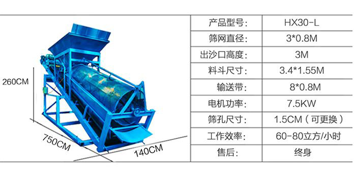 30滾筒篩沙機為標準版的篩沙機,處理量是60-80方/小時,料斗尺寸為3.4*1.55米,篩網直徑為3*0.8米,出料口高度為3米,電機功率為7.5kw。