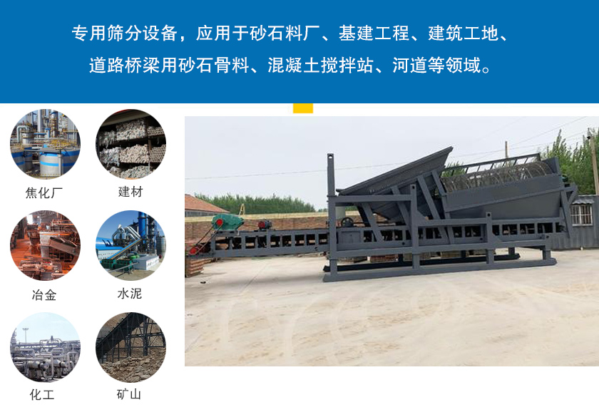30滾筒篩沙機克服了普通振動篩在篩分較濕物料時易出現的堵塞問題,是專門針對電廠、焦化廠、建材、冶金、水泥、化工、礦山等行業而研制的專用篩分設備,應用于砂石料廠、基建工程、建筑工地、道路橋梁用砂石骨料、混凝土攪拌站、河道等領域。