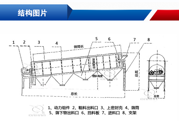 滾筒式篩分機篩主要有電機、減速機、滾筒裝置、機架、密封蓋、進出料口組成。當GTS滾筒篩啟動后,即破碎的石料進入滾筒后,一方面隨著滾筒轉動而被篩選,靠滾筒旋轉的離心力及跳汰作用來篩分物料,一方面粒度大的石料沿著滾筒的斜度向前流動,通過不同網目的的篩網逐漸被篩出,由于物料在滾筒內的翻轉、滾動,使卡在篩孔中的物料被彈出,可防止篩孔堵塞。