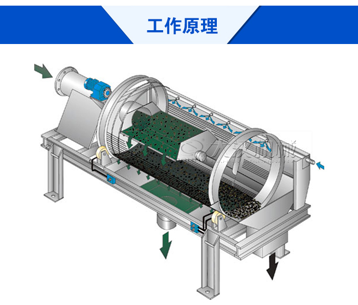 陶瓷油料滾筒篩主要有電機、減速機、滾筒裝置、機架、密封蓋、進出料口組成。滾筒裝置傾斜安裝于機架上。 電動機經減速機與滾筒裝置通過聯軸器連接在一起,驅動滾筒裝置繞其軸線轉動。當物料進入滾筒裝置后,由于滾筒裝置的傾斜與轉動,使篩面上的物料翻轉與滾動,使合格物料(篩下產品)經滾筒外圓的篩網排出,不合格的物料(篩上產品)經滾筒末端排出。由于物料在滾筒內的翻轉、滾動,使卡在篩孔中的物料可被彈出,防止篩孔堵塞。
